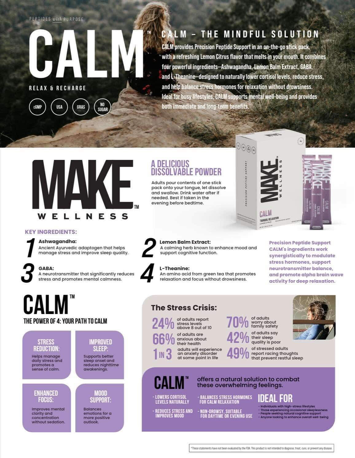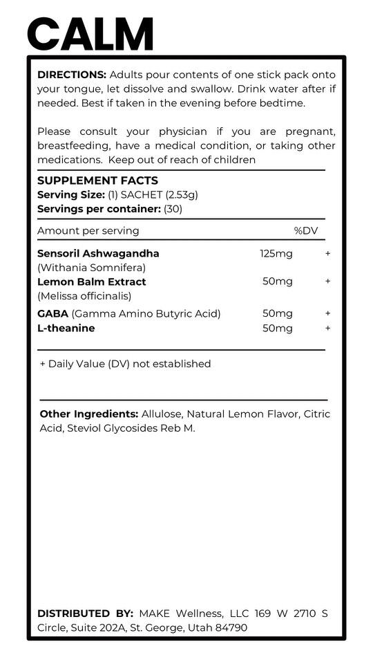 Calm.... is for anyone who feels stressed, overwhelmed, or just needs a moment to breathe. Whether life feels non-stop or your mind won’t stop racing, CALM helps you relax without making you feel drowsy. It’s like a little reset button, so you can stay cool, collected, and ready to take on whatever comes next.