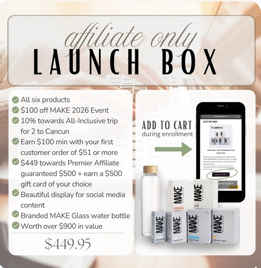 You're NOT required to order a Launchbox to become an Affiliate, but after watching the video, you'll see all the benefits of doing that. You're going to quickly begin to see the benefits of ALL the products that Make Wellness provides and you'll be able to better share with potential customers!Please reach out to me for any questions! It would be an honor to have you.